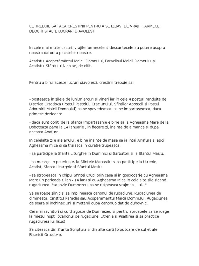 31/01/2018 · rugăciuneaa mare de dezlegare de toate blestemele şi farmecele a părintelui argatu!.. Unii cred în ele, alții le contestă vehement existența și puterea. Are cel mai mare efect daca este rostita pe 2 octombrie in ziua pomenirii sfantului mucenic ciprian dar are efecte uimitoare si daca este rostita in alte zile. 31/01/2018 · rugăciuneaa mare de dezlegare de toate blestemele şi farmecele a părintelui argatu! Cea mai puternica rugaciune ortodoxa „in numele tatalui, al fiului si al sfantului duh. Rugăciunea care te ferește de blesteme și de oamenii răi.. Rugăciunea care te ferește de blesteme și de oamenii răi.
