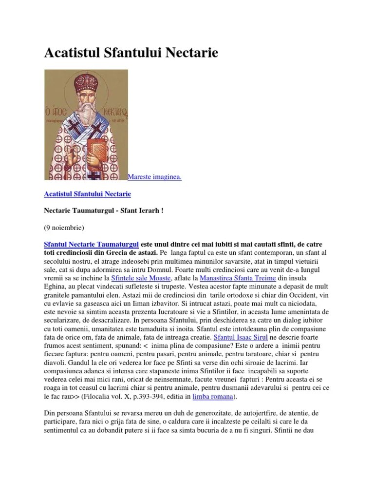 Sfântul nectarie, ierarhul din insula eghina, este prăznuit pe 9 noiembrie. Sfântul nectarie, ierarhul din insula eghina, este prăznuit pe 9 noiembrie. A facut minuni pentru sute de bolnavi. Este recunoscut că aduce vindecare celor bolnavi de cancer, dar și că ascultă rugăciunile femeilor care nu pot avea copii.. O, preasfinte și întru tot lăudate, mare făcătorule de minuni nectarie, primește această puțină rugăciune de la noi, nevrednicii robii tăi, căci către tine, ca la un adevărat izvor de tămăduiri și grabnic folositor și ajutător preaminunat scăpând și.
